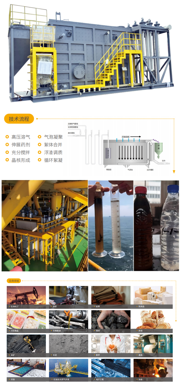 气体溶解组件和加药组件是对传统气浮技术的突破,它们被集成在一起,不仅使气体溶解得更好,而且减少了占地面积和投资成本。它主要用于石油生产中采出水的油水分离,可以替代传统使用的斜板气浮装置。