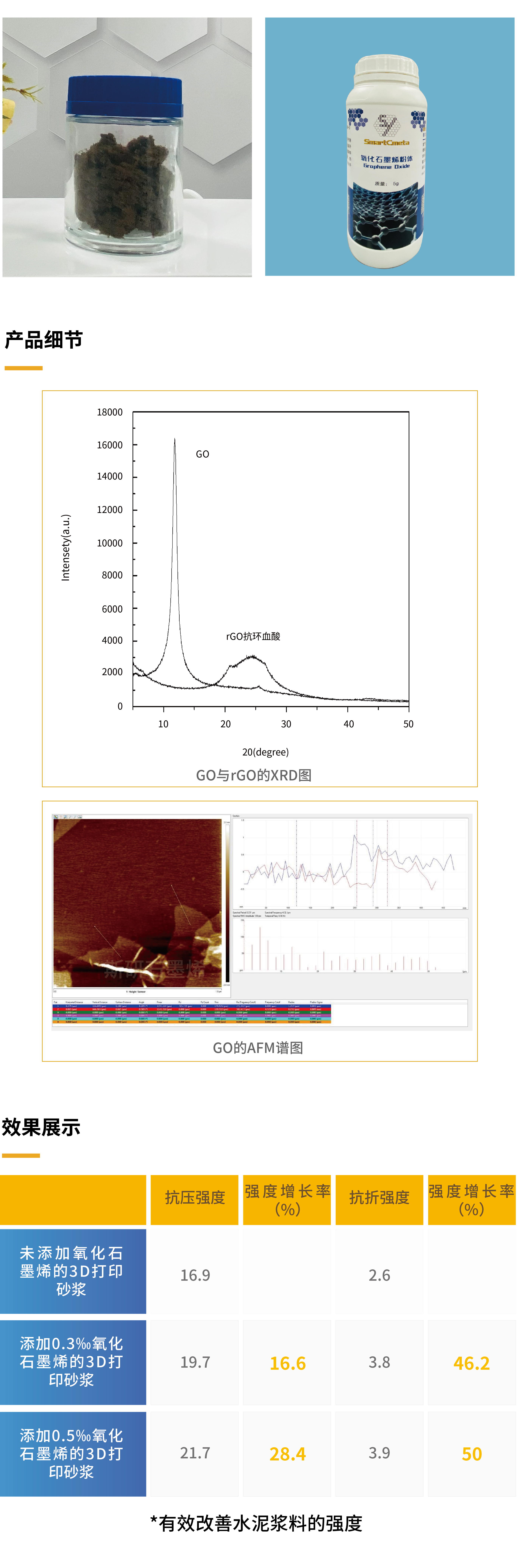 氧化石墨烯是石墨烯的氧化物,一般用GO表示,颜色为棕黄色,首先由改进的Hummes法制备得到浆料,再通过冷冻干燥得到高品质氧化石墨烯粉末。GO不仅含有SP2杂化碳原子,一部分碳碳双键被含氧官能团打断,成为SP3杂化;氧化石墨烯表面含有大量官能团,如—OH、—COOH、—O—等,这些官能团赋予氧化石墨烯一些新的性能,如分散性良好、亲水性、增加了与聚合物的相互作用性等。