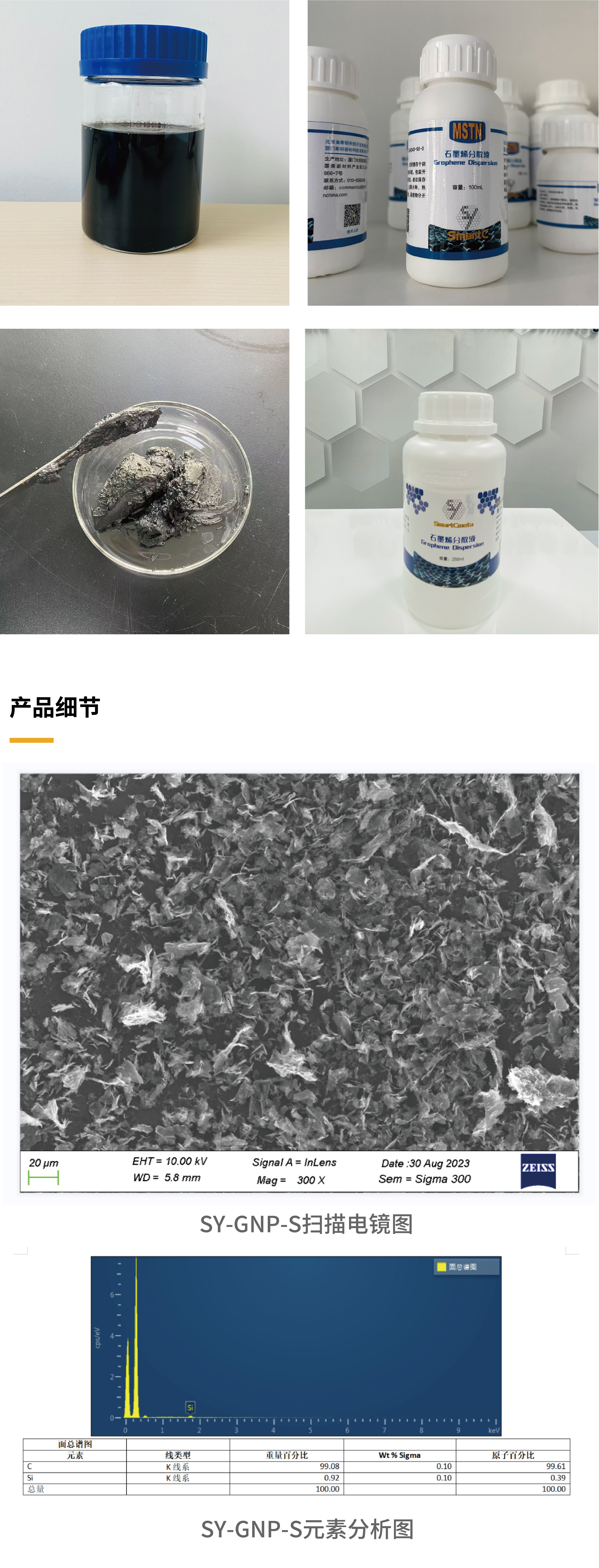 本产品以天然鳞片石墨为原料通过物理剥离工艺得到石墨烯产品。具有纯度高、比表面积大、稳定性高等优点,物理法剥离的石墨烯纳米片不存在强氧化剂的氧化过程,不引入晶格缺陷,导电性能优异。最常用分散剂为水,同时乙醇、乙酸、NMP、DMF等也可以作为石墨烯的分散剂。石墨烯分散不稳定,常需要加入适量的分散助剂。