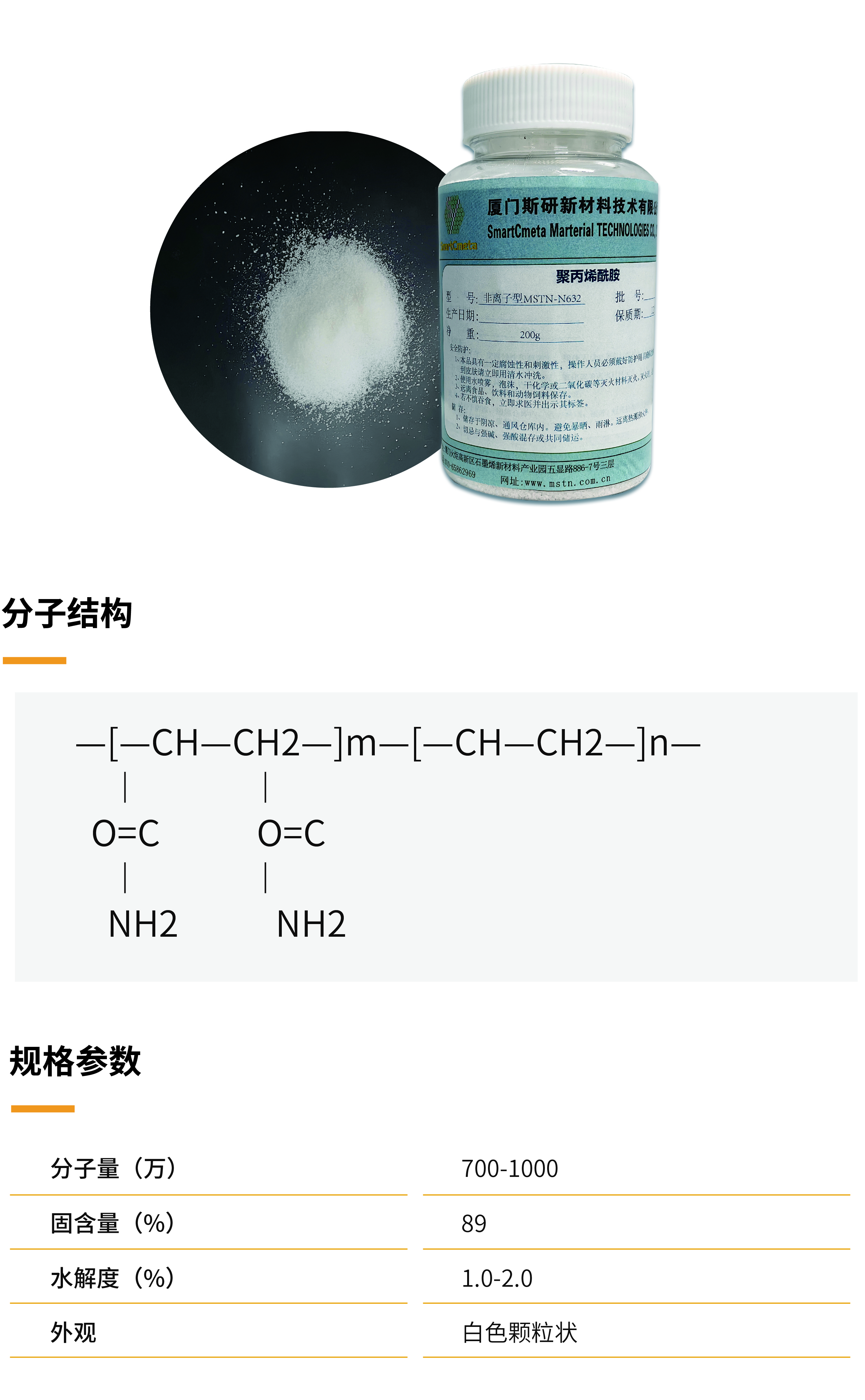 亲水性高:MSTN-N632非离子聚丙烯酰胺由于分子链含有酰胺基团或离子基团,故其显著特点是亲水性高,可以各种比例溶于水中。