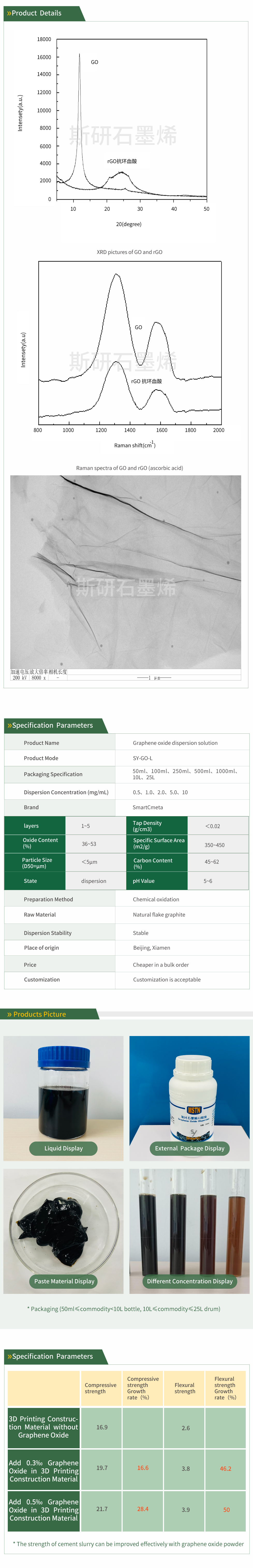 Graphene oxide is the oxide of graphene, generally denoted by GO, the color is brownish-yellow, firstly prepared by the improved Hummers method to get the slurry, and then freeze-dried to get the high-quality graphene oxide powder. GO not only contains SP2 hybridized carbon atoms, part of the carbon-carbon double bond is interrupted by the ox- ygen-containing functional groups, which becomes the SP3 hybridization; the surface of graphene oxide contains a large number of functional groups, such as -OH,-COOH,-O-, etc. These functional groups give graphene oxide some new properties, such as good dispersion, hydrophilicity, increased interaction with polymers and so on.