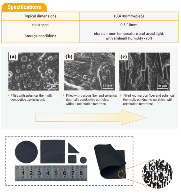 As a kind of thermal interface material, thermally conductive pads are used between various heat sources and heat sinks. By eliminating the air between the heat source and the heat sink, the heat of electronic devices is distributed more evenly and the heat dissipation efficiency is improved. To achieve good thermal conductivity, the shape and size can be die-cut according to customer requirements. The thickness depends on the product gap size and the density, hardness, compression ratio and other parameters of the pad itself.The carbon fiber with high thermal conductivity is added to the conventional thermally conductive pads, and then is oriented by a special process, so that it has ultra-high thermal conductivity in the vertical direction, which is suitable for various devices generating more heat.