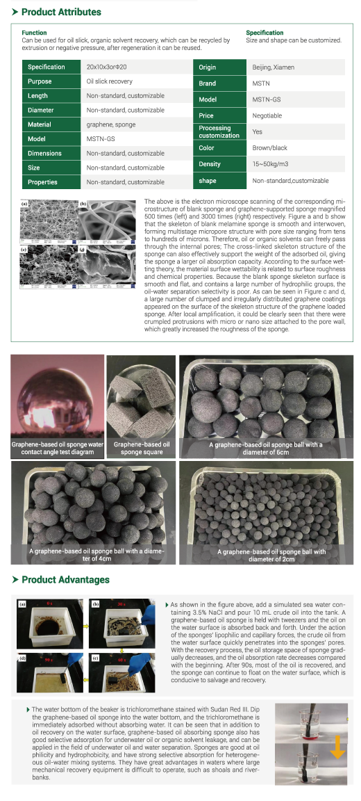 By combining the lipophilic and hydrophobic graphene with ordinary commercial porous sponges, the graphene-based oil absorbing sponge is obtained. The graphene composite sponge not only has the high strength and high resilience of sponges, but also has the hydrophobicity of graphene. It can be used to deal with the oil leakage accidents in the process of oil exploitation, refining and transportation, as well as the organic solvent pollution used and discharged in the chemical industry. Graphene-based oil sponge can absorb 100 times its own weight of various oil and organic solvent pollutants. When the sponge is treated with oil spill pollution instead of oil absorbing felt, it can still float on the water surface after absorbing oil, which is easy to salvage and recycle, and it can be reused more than thousands of times.