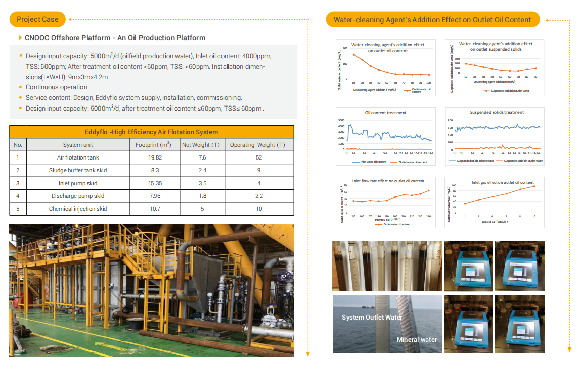 The gas dissolution component and the dosing component, a breakthrough improved from the conventional air flotation technology, are integrated, not only making the gas dissolved better, but also reducing the footprint and investment cost. It is mostly used for oil-water separation of produced water in oil production and can replace the traditionally used inclined plate and air flotation device.