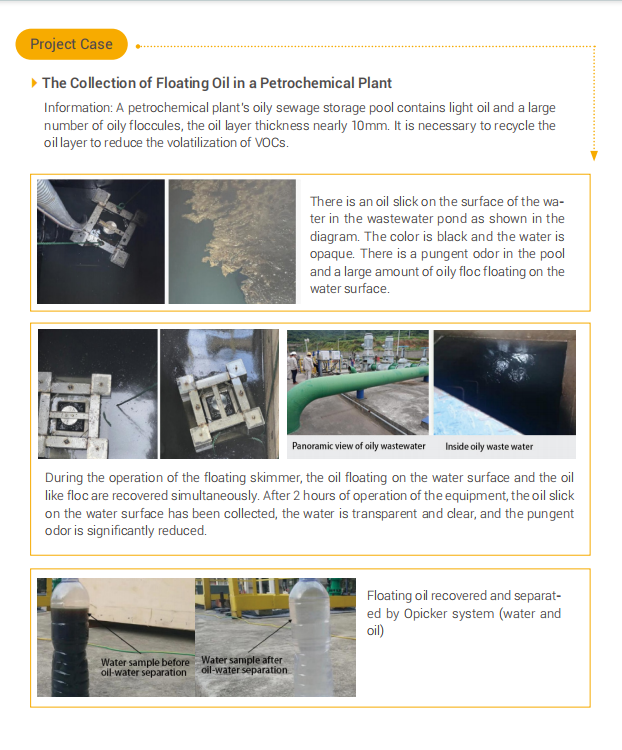 This system, composed of the oil collection and oil-water separation components, uses the oil and water den- sity difference to recover the floating oil on water. It is a purely physical treatment process using the principle of laminar flow and gravity separation. It can be used as an oil collector, and can also be used to separate liquids of different specific gravity. It is a new oil collection equipment that is energy saving, environmentally friendly and ef- ficiently, bringing economic and environmental benefits.