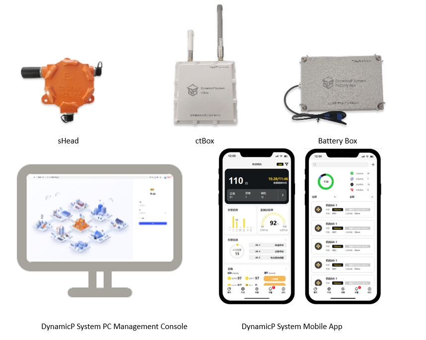 The DynamicP System consists of a perception layer hardware device network consisting of sHead, ctBox, and Battery Box with a mobile app and a PC management platform for data viewing and device management. The overall system adopts passive power supply and wireless deployment.