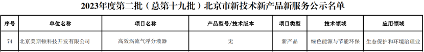 Recently, the Beijing Municipal Science & Technology Commission, Administrative Commission of Zhongguancun Science Park announced the list of Beijing New Technologies, New Products, and New Service for the second batch (the 19th batch) of 2023. With advantages such as advanced technology level, product innovation ability, and reliable quality, MSTN’s independently developed " High-Efficiency Eddy Air Floatation Separator " has been recognized as "Beijing New Technology and New Products and New Service".