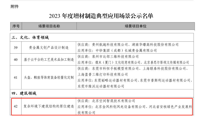 On December 15, 2023, the Equipment Industry Department of the Ministry of Industry and Information Technology released the public notice on the list of typical application scenarios for additive manufacturing in 2023. Among them, there are 27 typical application scenarios for additive manufacturing in the industrial field, 11 typical application scenarios for additive manufacturing in the medical field, 3 typical application scenarios for additive manufacturing in the cultural and sports fields, and 1 typical application scenario for additive manufacturing in the construction field. Beijing SpaceDicon Technologies Company was successfully selected as a typical application scenario for additive manufacturing in the construction field with its "In situ Construction of Building Structures in Complex Environments", becoming the only selected enterprise in this field.