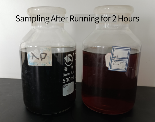 After the device is started, it runs continuously for more than 1200 hours, and the initial oil content of the amine liquid in the inlet fluctuates between 50-1700 mg/L. After passing through the graphene modified material device, the oil content of the amine liquid in the outlet drops to 13-25mg/L. The amine liquid has zero loss throughout the entire treatment process, and the system runs smoothly with stable output indicators.