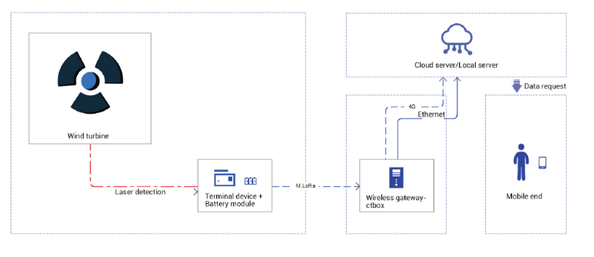 The sHead terminal detects the transmission status of wind turbine equipment through laser sensors, collects data, and wirelessly transmits it to ctBox through Lora. ctBox sends the data to the cloud through 4G communication (local deployment via Ethernet also available), and the user's mobile app requests information from the cloud server to obtain real-time wind turbine equipment status information and various alarm information.