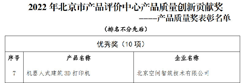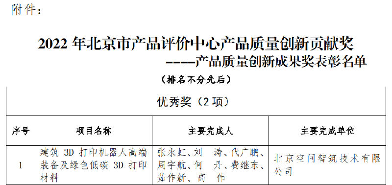 Recently, Beijing Product Evaluation Center announced the commendation list of "2022 Product Quality Innovation Contribution Award". After a multi~layered and strict evaluation, the innovative product "Construction 3D Printing Robot High~end Equipment and Green and Low~carbon 3D Printing Material" independently developed by Beijing SpaceDicon Technologies Co., Ltd The "Robotic Construction 3D Printer" won the 2022 Beijing Product Evaluation Center - Product Quality Award.