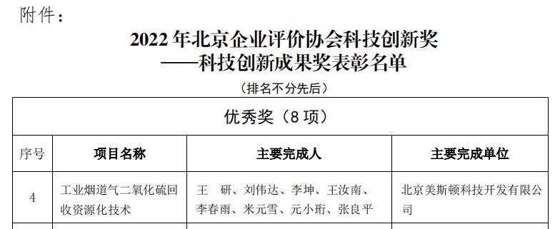 Recently, according to the "Beijing Enterprise Evaluation Association Innovation Award Management Measures", and in accordance with the evaluation system and relevant requirements of Beijing Science and Technology Innovation Award, after the evaluation by the expert group, "Sulfur Dioxide Recycling and Resourcefulness Technology for Industrial Flue Gas Recycling" independently researched and developed by MSTN technologies Co., Ltd was awarded with the 2022 Beijing Enterprise Evaluation Association Science and Technology Innovation Award - Excellence Award.