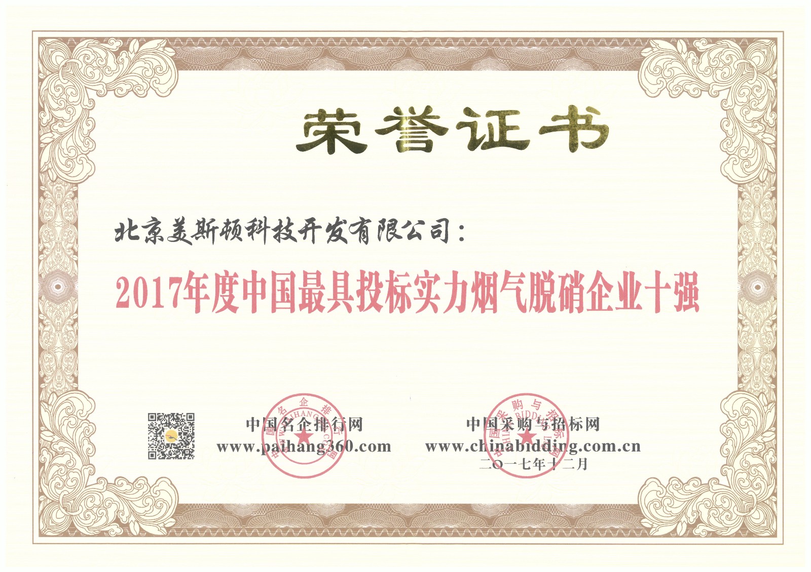 In 2017, the Procurement and Bidding Network of China and the Ranking Network of Famous Chinese Enterprises jointly sponsored the "4th Comprehensive Evaluation of Air Control Bidding and Procurement of China in 2017" with the theme of "Protecting Blue Sky and Setting Benchmarks". It aims to select high-quality flue gas treatment enterprises, standardize the bidding and purchasing practices, promote the healthy development of the industry and make unremitting efforts to win the "Battle of Blue Sky".