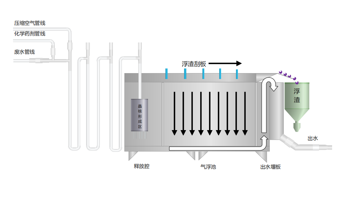 高效涡流三相分液系统的污水全溶气设计实现气、液、固三相混合,完善的压力调节系统能使气泡产生于晶核形成状态,实现接近零的最小气泡直径,并直接生长在絮体颗粒内,无需附着过程。该技术特性实现了絮体上浮的革新,省去了溶气水制备、循环水系统和缓慢低效的气泡附着过程,实现前所未有的浮渣去除效率和设备超小体积,节省80%占地面积和大量基建投资。