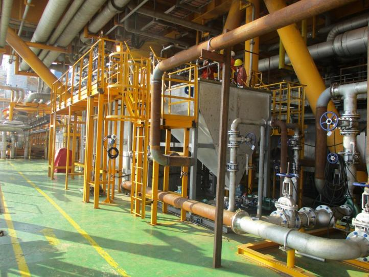 美斯顿公司在某海上平台对其5000m3/d油田生产水进行处理,处理前含油量为1000~5000mg/L、TSS含量为300~400mg/L,处理后含油量低于50mg/L、TSS含量低于40mg/L。设备分为气浮撬、排渣撬、加药撬、泵撬等,总综合占地面积75m2,核心设备占地面积12m2。